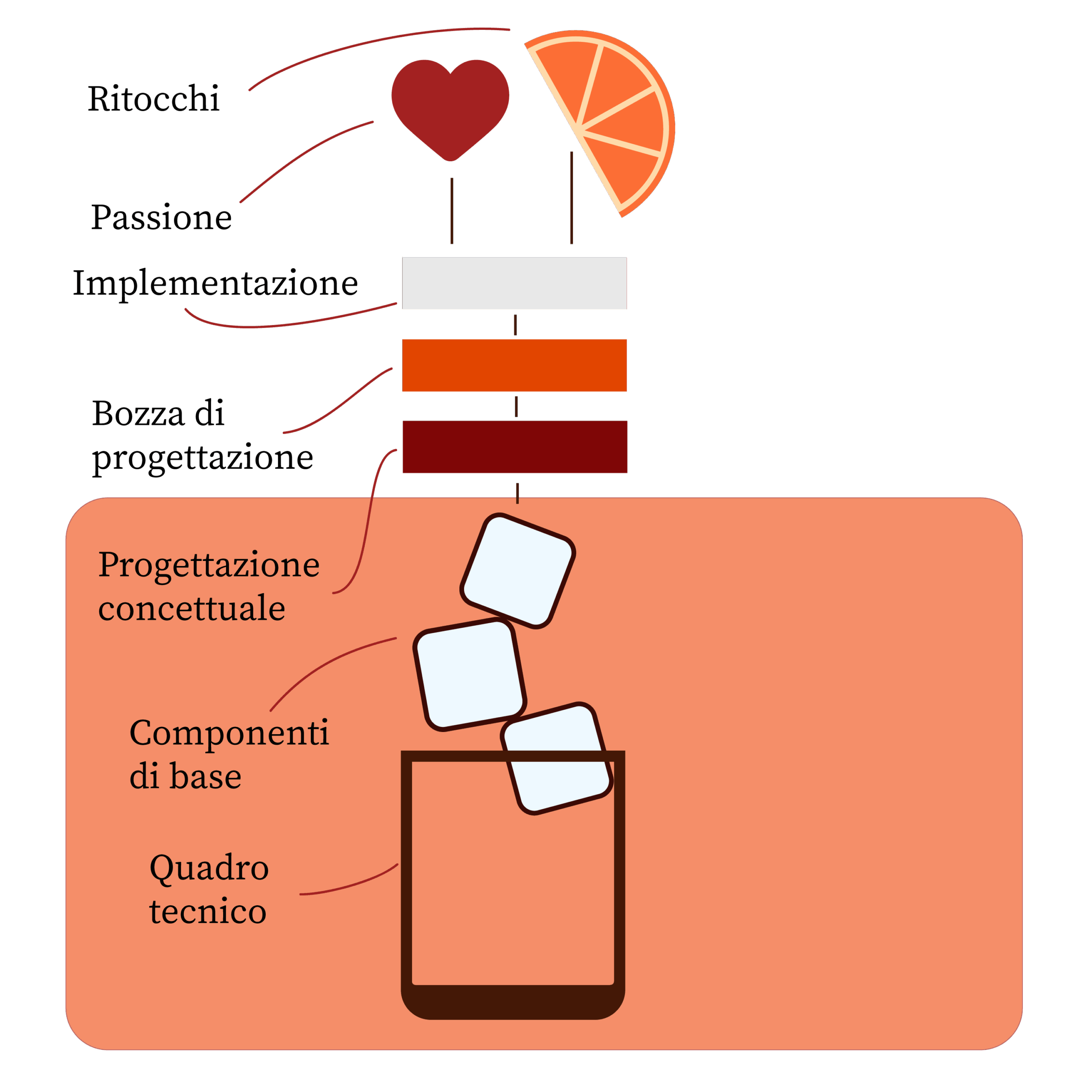 Sul muro del bar era appeso un disegno sull’anatomia dei cocktail, che mi ha fatto riflettere su quanto gli aperitivi e i siti web siano simili: è proprio la combinazione sapiente di ingredienti semplici a creare un’esperienza indimenticabile – nel bicchiere o nello sviluppo web – o, come dico da allora: in un aperidev.